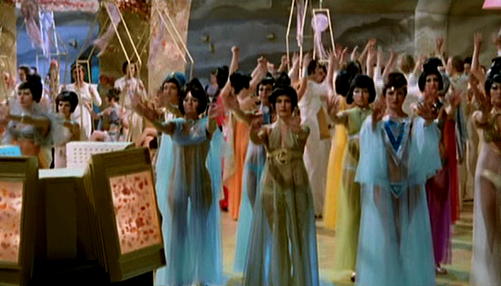 Sasse’s score varies from jazzy pop à la Can’s Tago Mago to abstract numbers resembling the electronica of Beaver & Krause. Most of the time, the music is combined with modern dance numbers performed by a bevy of heavily made-up women in colorful harem costumes. In one memorable scene, The Chief (whose hair color changes in every scene) serenades Akala, the spaceship’s captain, in a hall of mirrors filled with the usual dancing women. The Chief performs this number on a musical instrument that looks exactly like what it is: a plywood board covered with Christmas lights. Like the nude dancing scene, it does nothing to move to plot forward and further bolsters the effect that In the Dust of the Stars is really a musical revue that has been interrupted by a slave revolt.