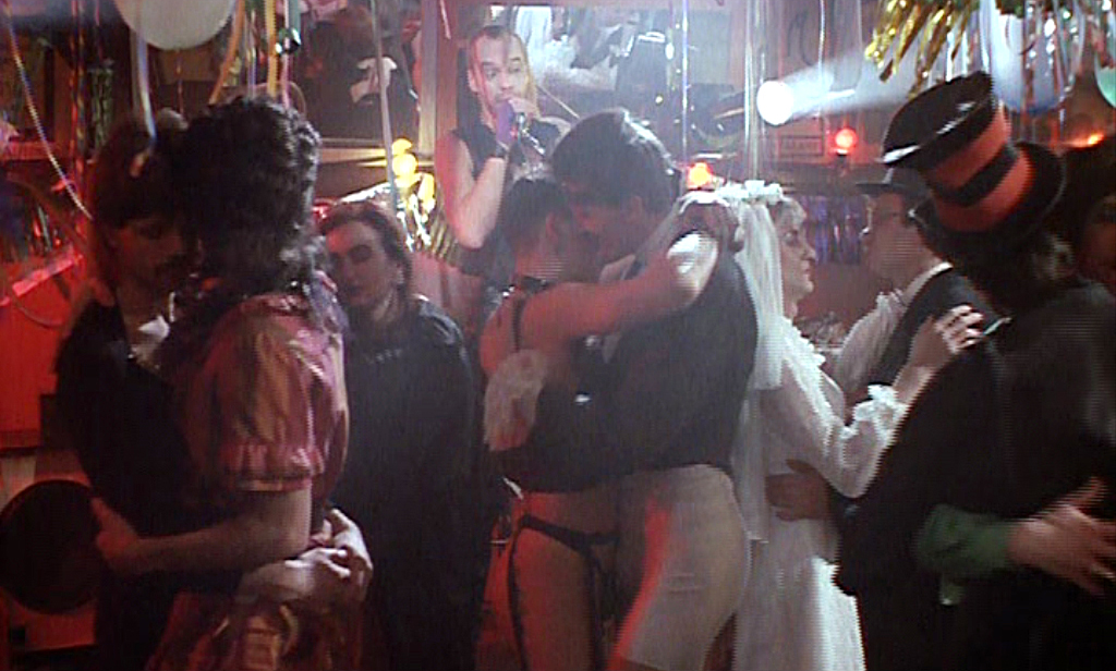 The sex in Coming Out is handled with candor. The film makes a point of showing the many sides of gay life in East Germany, from the old to the young, both happy and sad. The two leading men are attractive and make a believable couple. The gay bar scene is reminiscent of what the scene must have been like in the West before it became respectable. John Waters would be right at home here (although Matthias in mime facepaint with a tutu around his neck might cause him to run screaming from the place).