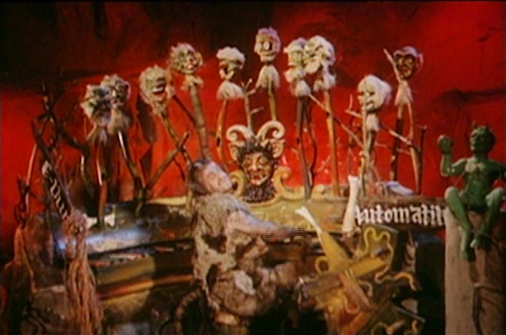 Production design was by Georg Kranz, one of DEFA’s best. Especially notable is his wild set for Hell, which seems to have taken some of its inspiration from Alfred Hirschmeier’s planet Venus in The Silent Star. The floor bubbles with multi-colored goop, and the Devil arrives via a Rube Goldberg contraption that delivers him automatically to his bed. In one corner sits an enormous pipe organ with weird puppet heads atop the pipes that open their mouths when those notes are played.