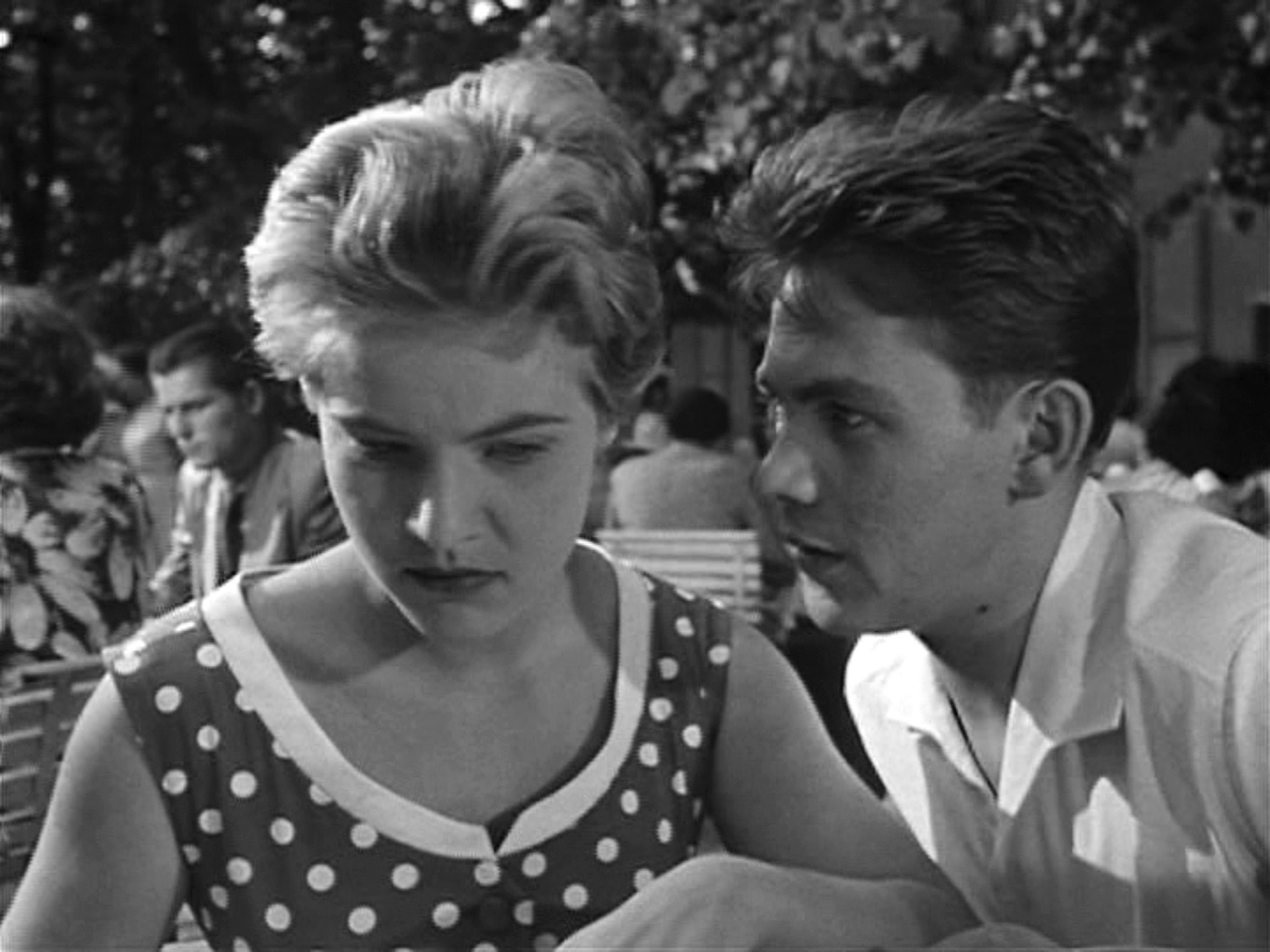 Part of the fun of this film is in its use of details—the way the transistor radio acts as both a lure and an irritant, the obnoxious American soldier at the bar, and the names of films at the cinema. In one scene, as Uschi, Hans, and Lord enter the cinema to see a film called Lockende Sünde (literally “alluring sin,” but translated in the subtitles as Temptation), and in another the camera pauses briefly on a poster for a movie titled Die kleine Stadt will schlafen geh’n (The City Wants to Sleep). Unlike Lockende Sünde, this is a real movie that gets its name from a song that was popular during the Third Reich, but Klein uses it cleverly to take a dig at West Germany and the way it seemed to be ignoring the Nazi pasts of some government officials. All of the Klein/Kohlhasse films are filled with these small details and benefit from repeated viewing to catch them. Some things seem to be intended exclusively for the amusement of Berliners, both East and West.