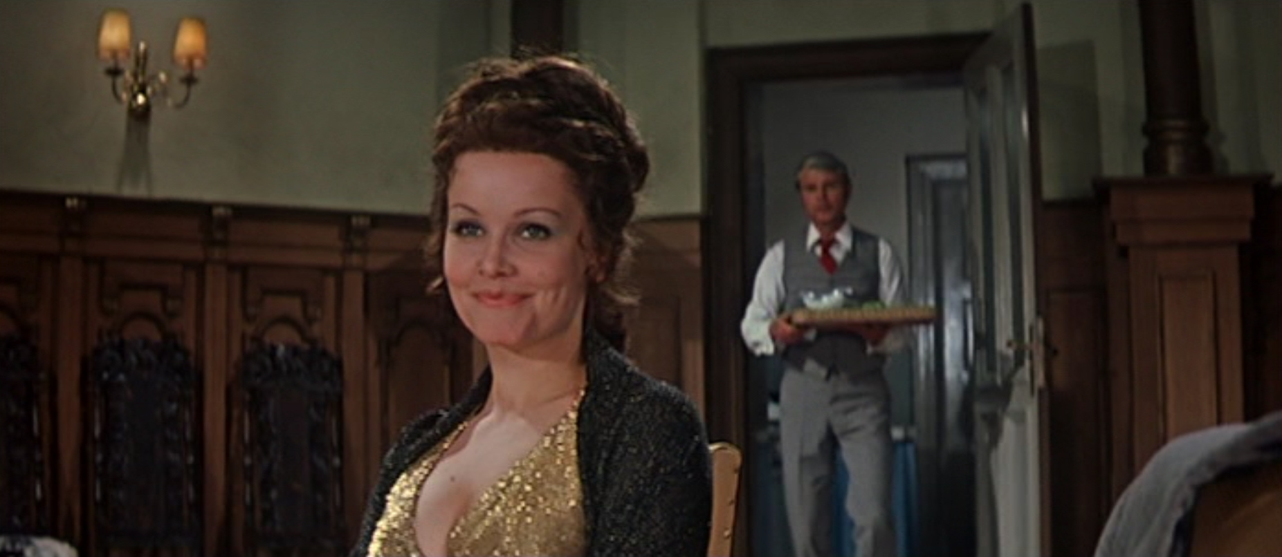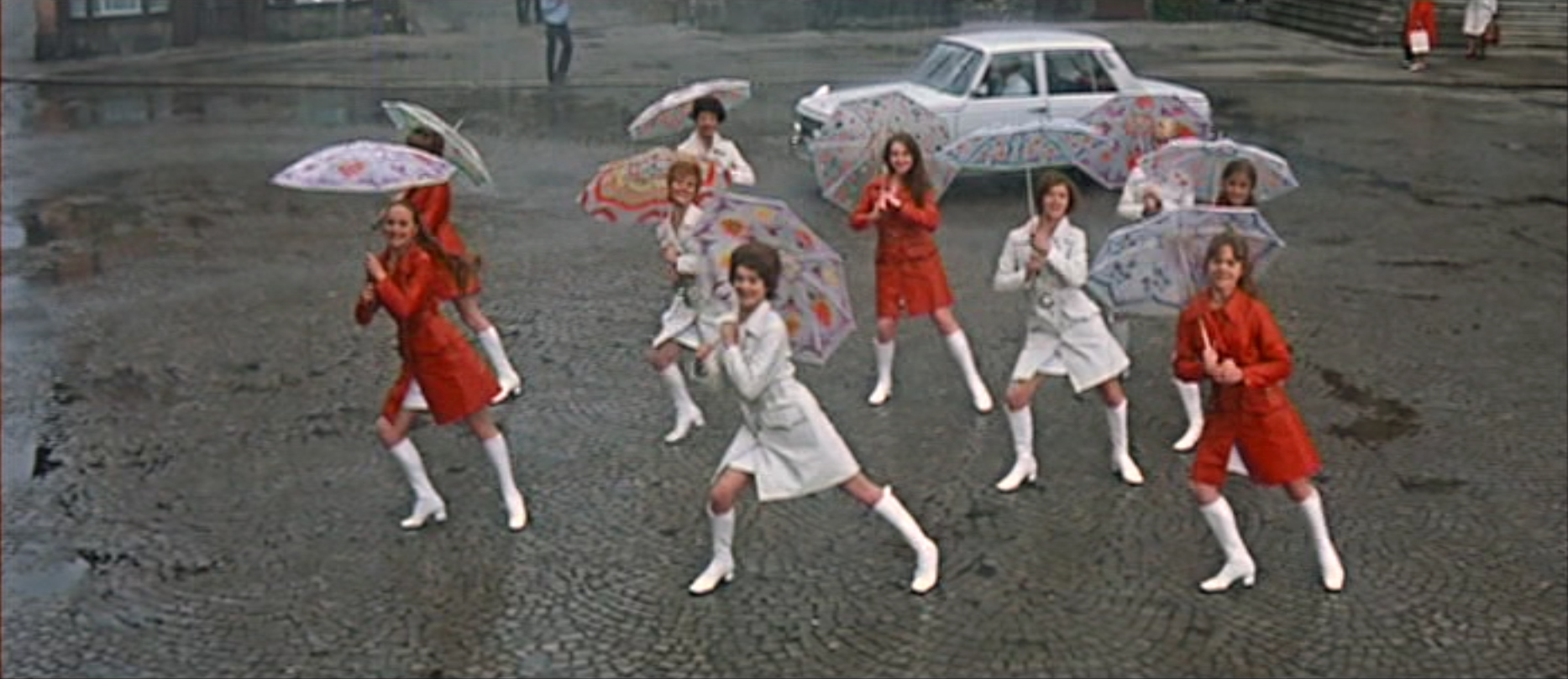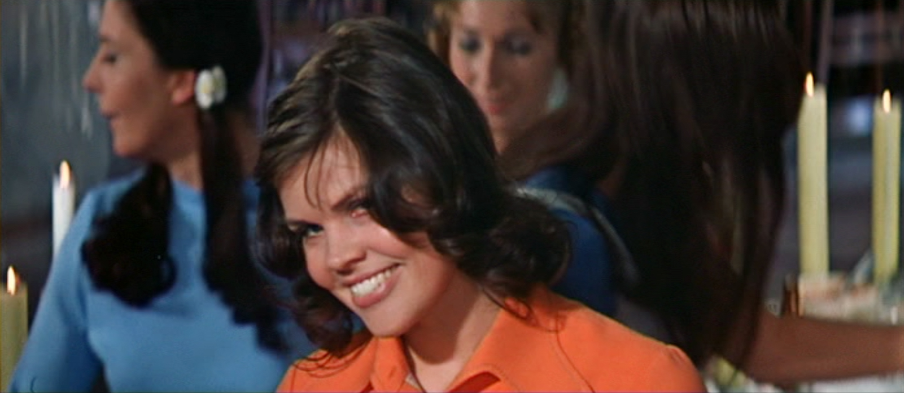 But the real stars of this film are the costumes and the dancing. The costumes were created by Helga Scherff. Ms. Scherff had already proved her talent for pop clothing design in Gottfried Kolditz’s entertaining musical Midnight Revue, and she would prove it again in Hostess. Like Star Trek and I Dream of Jeannie during the sixties, there seems to be a conscious effort here to cover up the navels of the women. You catch glimpses of them early in the film, but they are very fleeting. This is tricky business since several of Ms. Scherff’s outfits feature bare midriffs. In one case, decorative belts are worn that seem to have the sole purpose of hiding the navel. It is such an odd detail that I can’t help but suspect that these belts were added during production to placate the censors.