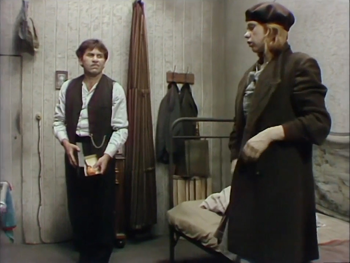 As noted in the Profesor Mamlock post, Friedrich Wolf was considered one of Germany’s best playwrights. While this version of Cyanide stays closer to its source material than did the 1930 film, it’s not a word-for-word adaptation. The teleplay was written by Jürgen Leskien and he takes liberties with Wolf’s script, presumably, in part to make it better suited to the live teleplay format and partly to make it match the East German Weltanschauung. Leskien was pilot in the East German Air Force (Luftstreitkräfte der Nationalen Volksarmee) and worked as a civil engineer in air traffic control before trying his hand at writing a novel. After he left the military service, he studied at the Leipzig Theater Academy and got a job as a dramaturge with East German television. Leskien’s changes, while understandable, remove some of the poetry of Wolf’s street language. For instance, the opening line of the play, in which a woman is asked if she’s cooking a street cat or an old horse (“Dachhase oder Hottehü?”), is replaced with the statement that the main character is late (hasn’t had her period). It gets us right into the story, but at what cost? Also missing is the character Cuckoo’s colorful, if sometimes confusing, nicknames for everything.